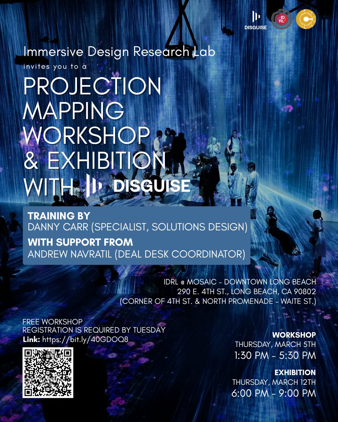 Projection Mapping Exhibition with Disguise Thursday, March 12 | IDRL @ Mosaic, Downtown Long Beach (290 E. 4TH ST., Long Beach, CA 90802) 6-9pm Stop by on March 12 from 6-9pm for a projection mapping exhibition of IDRL community work (student, faculty, and alumni) with support and training by Disguise. DTLB Instagram DTLB LinkedIn DTLB website
