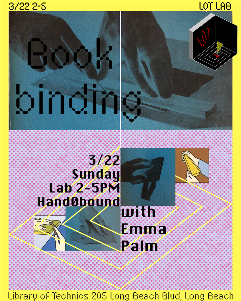 Join Emma Palm for bookbinding workshop at the Library of Technics, Long Beach. Library of Technics invites artists and protectors of craft to the Broadcasting Program, where the signal moves freely between source and receiver, continuing the chain of knowledge. LOT Lab consists of practices in repetition, critical thinking, and manual efficiency that support the formation and repair […]
